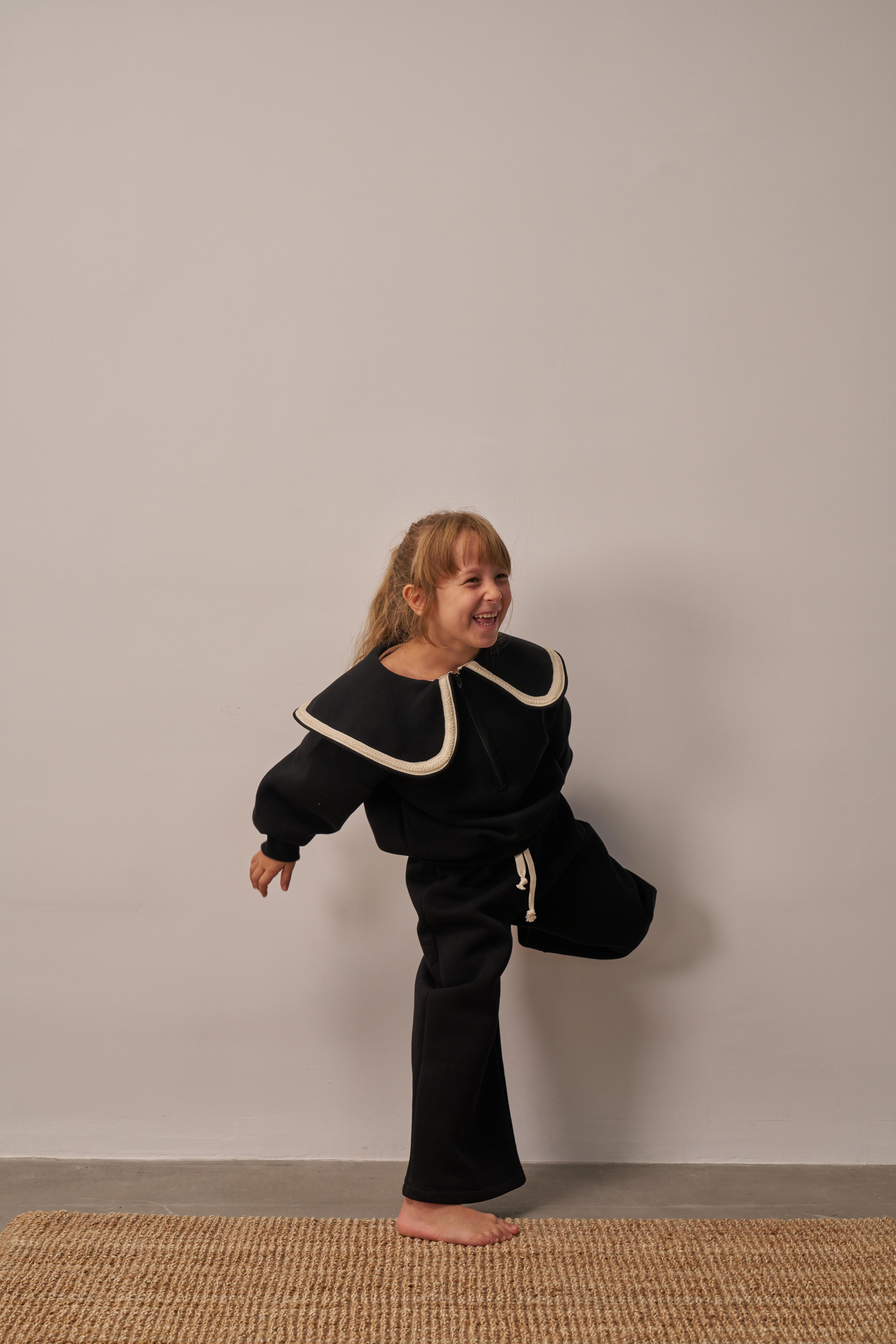 Çocuklar için özel olarak tasarlanmış  Oversize Takım, modern ve şık tasarımıyla konforu ön planda tutuyor. Geniş kesimi ve dikkat çeken kontrast biyeli büyük yakasıyla tarz sahibi minikler için ideal. Takım, oversize sweatshirt ve bol paça eşofman altından oluşuyor. Yumuşak dokulu kumaşı ile gün boyu rahatlık sağlarken, şık tasarımıyla da dikkat çekiyor.