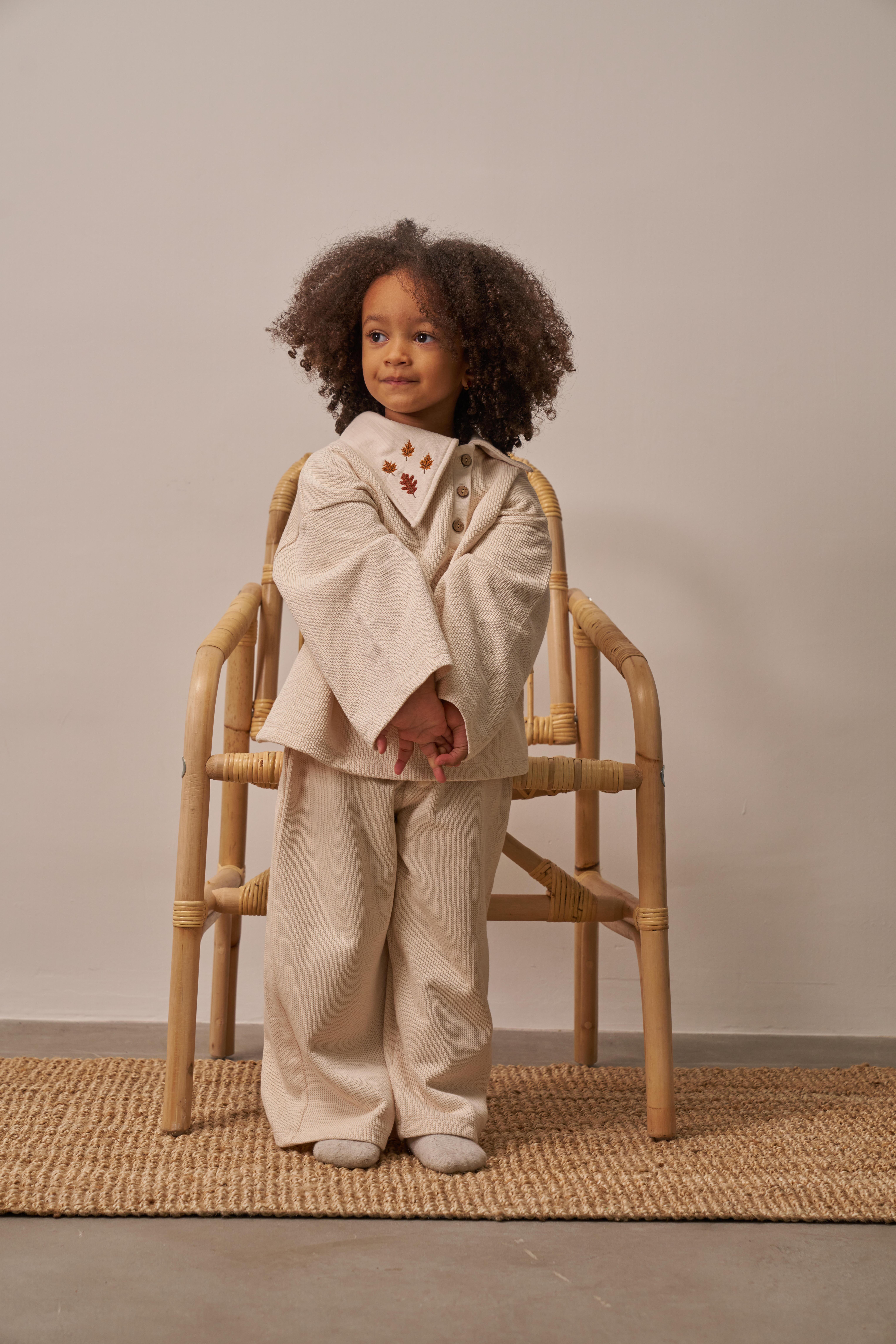 Çocuklar için özel olarak tasarlanmış bu rahat ve şık triko takımı, sonbaharın sıcak tonlarını yansıtan yaprak işlemeleriyle dikkat çeker. Yumuşak dokulu örme kumaşı sayesinde maksimum konfor sunar. Geniş yakası, düğme detayları ve dökümlü kesimiyle hem ev giyimi hem de günlük kullanım için idealdir. Unisex tasarımı sayesinde hem kız hem erkek çocuklar için uygundur.